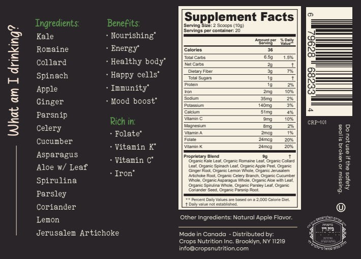 At Crops, we believe the best nutrition comes from real food. Greens is made without added vitamins, preservatives, or fillers, allowing the natural properties of the ingredients to remain intact. Crafted to fit easily into a daily routine, this blend offers a simple way to incorporate a wide variety of green foods into everyday life.